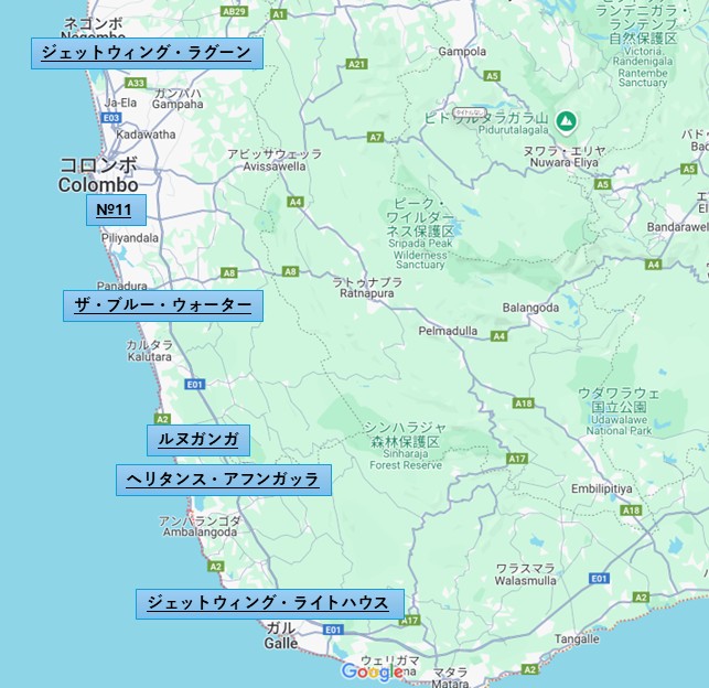 ジェットウィング・ラグーン(Jetwing Lagoon )/ナンバーイレブン(No.11 )/ ヘリタンス・アフンガッラ(Heritance Ahungalla) / ジェットウィング・ライトハウス(Jetwing Lighthouse)/ ルヌガンガ(Lunuganga) / ザ・ブルー・ウォーター(The Blue Water )