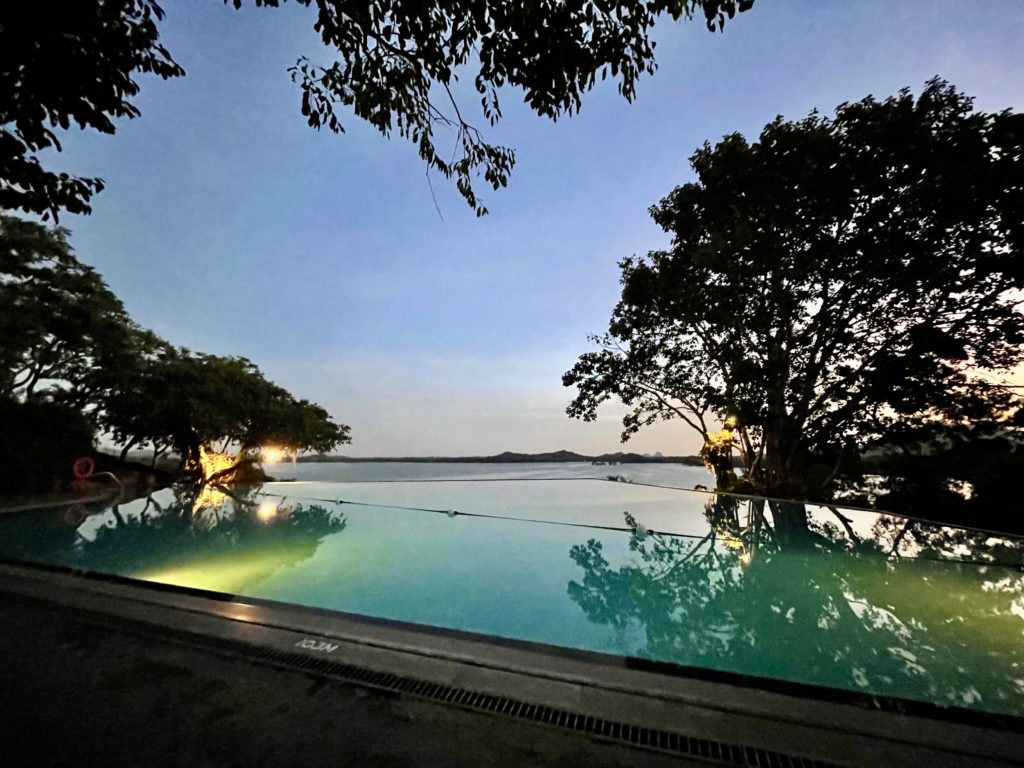 ライトアップされたインフィニティプール、向こうに広がるカンダラマ湖(人造湖)と一体化