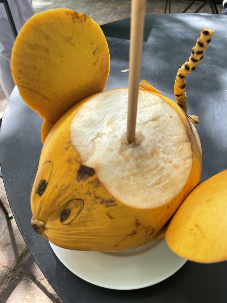 ヤシの実ジュースを頼んだら、可愛いミッキーマウス風になって出てきました。ついボールペンで目を入れたくなって笑