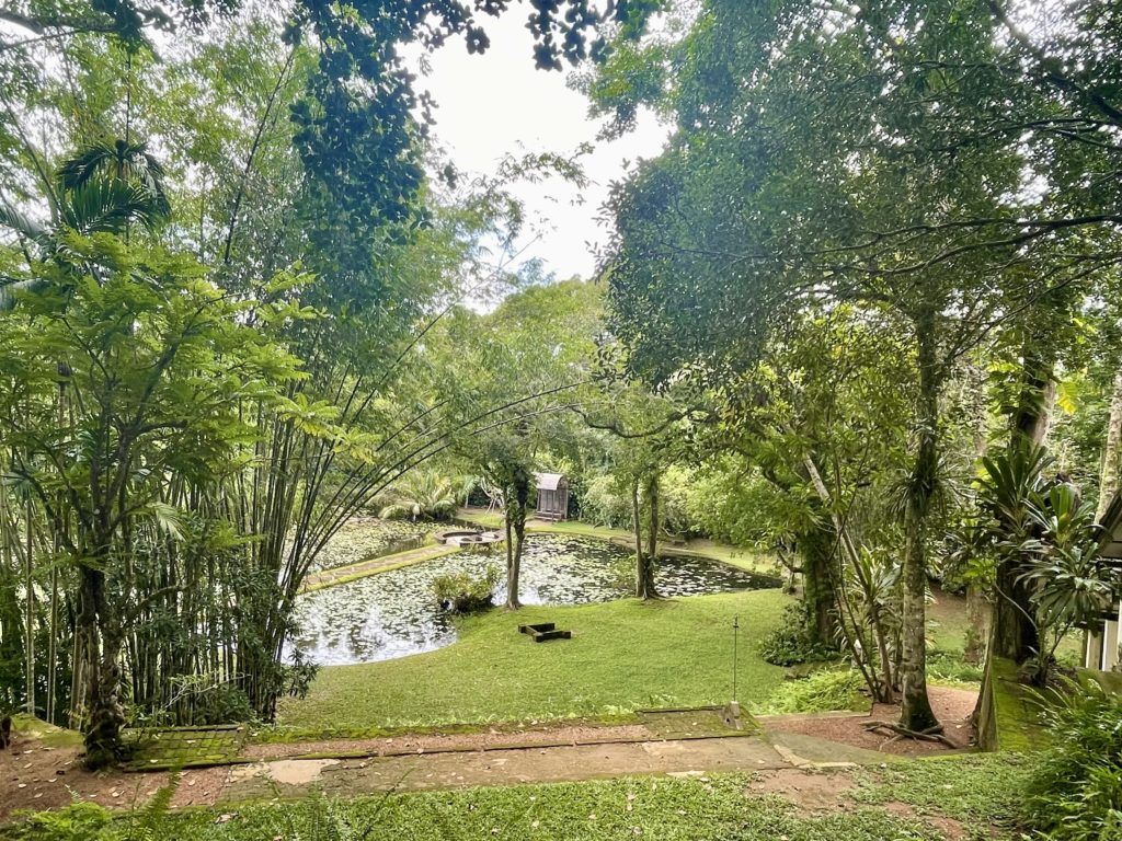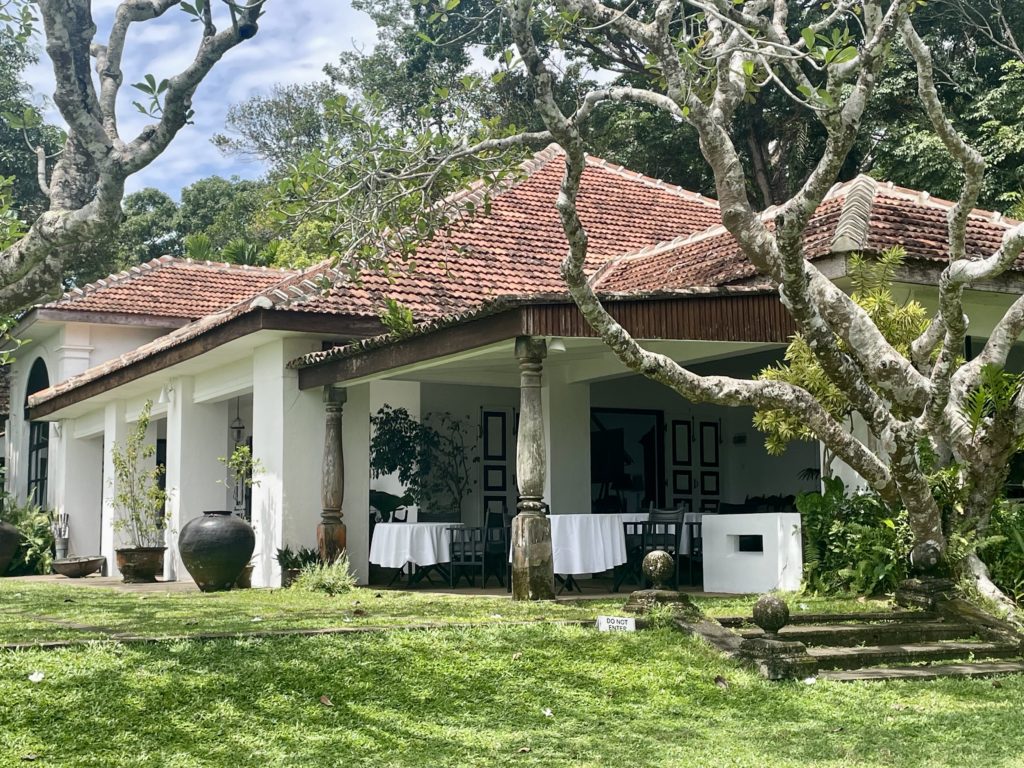 同じ場所の写真、建物の前に大きく枝を広げているのはプルメリア。建物、庭、樹々、景色、家具や調度品まで、外からの景色、建物内部から外を見た景色(ツアーでは見られなかった)、光が創り出す影さえも、空間を構成する全てを計算している。盆栽には詳しくないので詳細は割愛するが、盆栽に見るようにプルメリアの枝の広がりも自然のままではなくデザイン・加工され、ジャングルの中によく手入れされた芝生が広がる。熱帯雨林と、ヨーロッパ風の庭園が違和感なく存在している。バワ自身がアジアとヨーロッパのハーフだったから、この発想が生まれたのかもしれない。