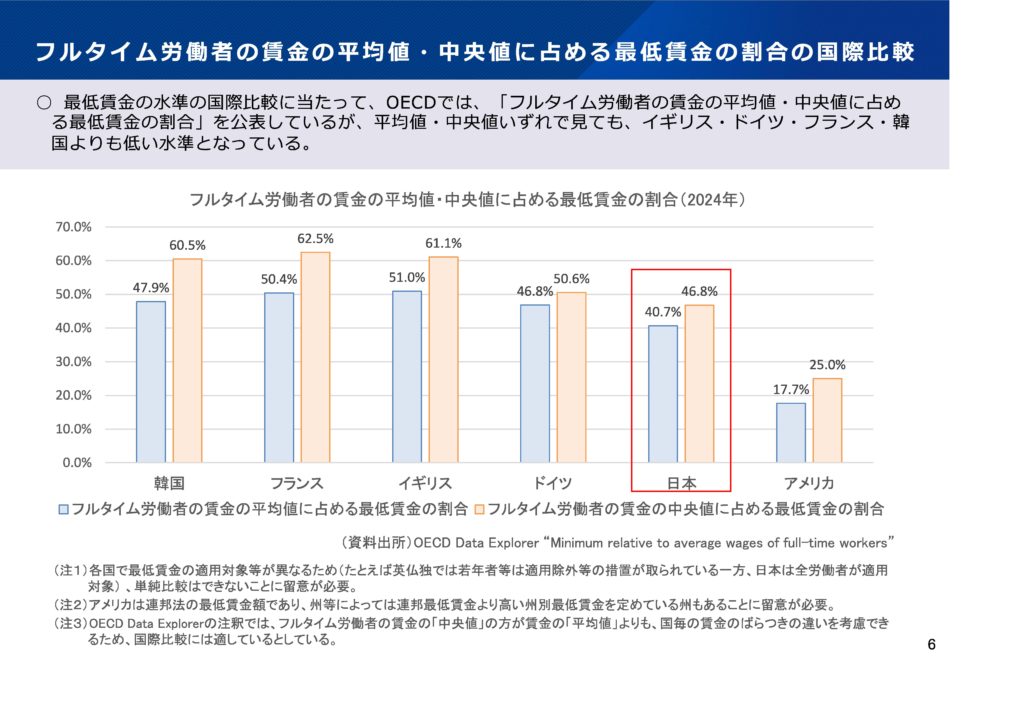 アメリカは真逆だよ。連邦最低賃金は2009年から7.25ドルで据え置き。もう15年以上放置されてる。だから、平均賃金に対して最低賃金の比率が極端に低いという世界でも稀な国になってる